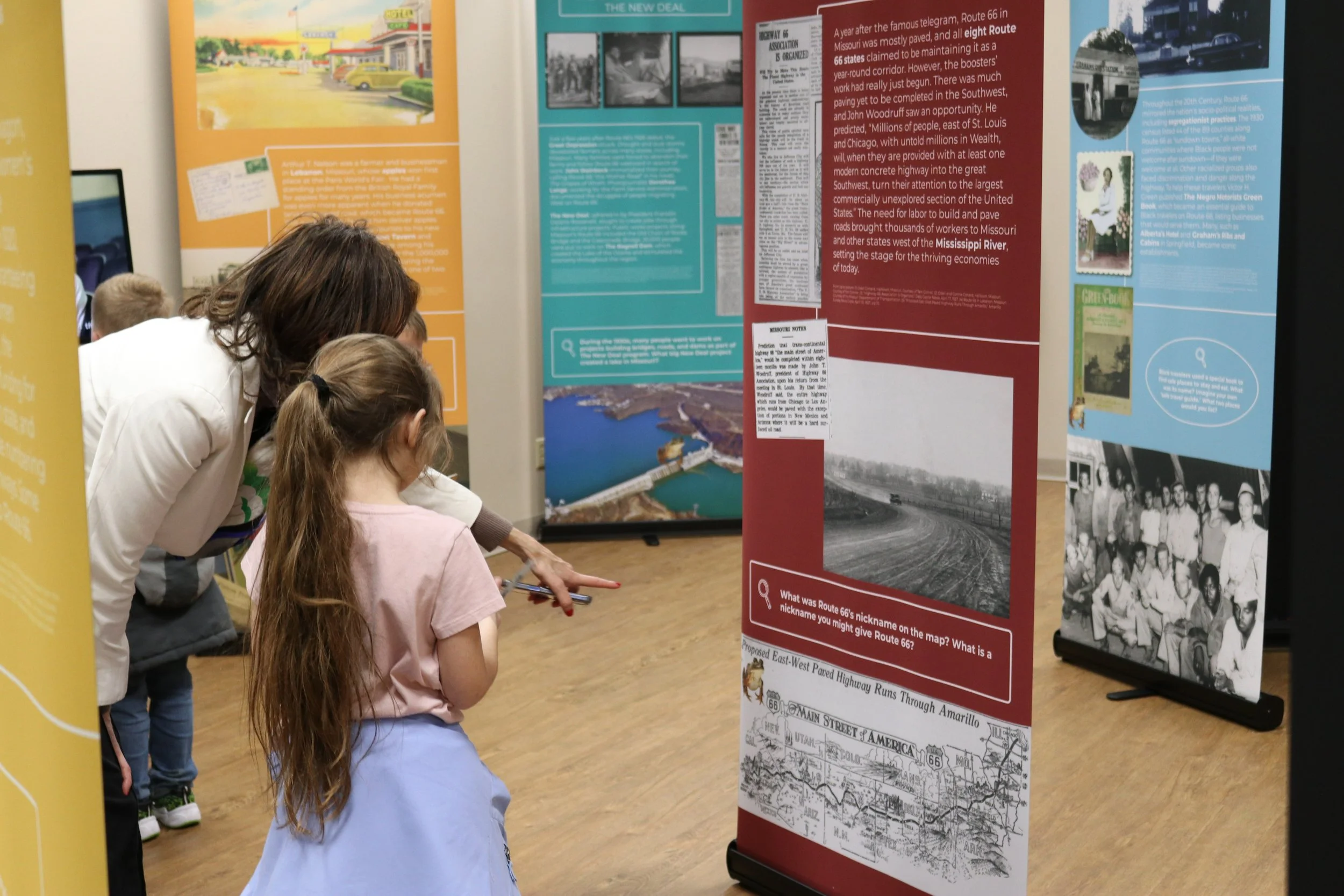 Students worked through interactive Passport Books as they moved through the panels, adults gathered around archival footage and first-person accounts, and visitors of all ages contributed their own Route 66 memories.